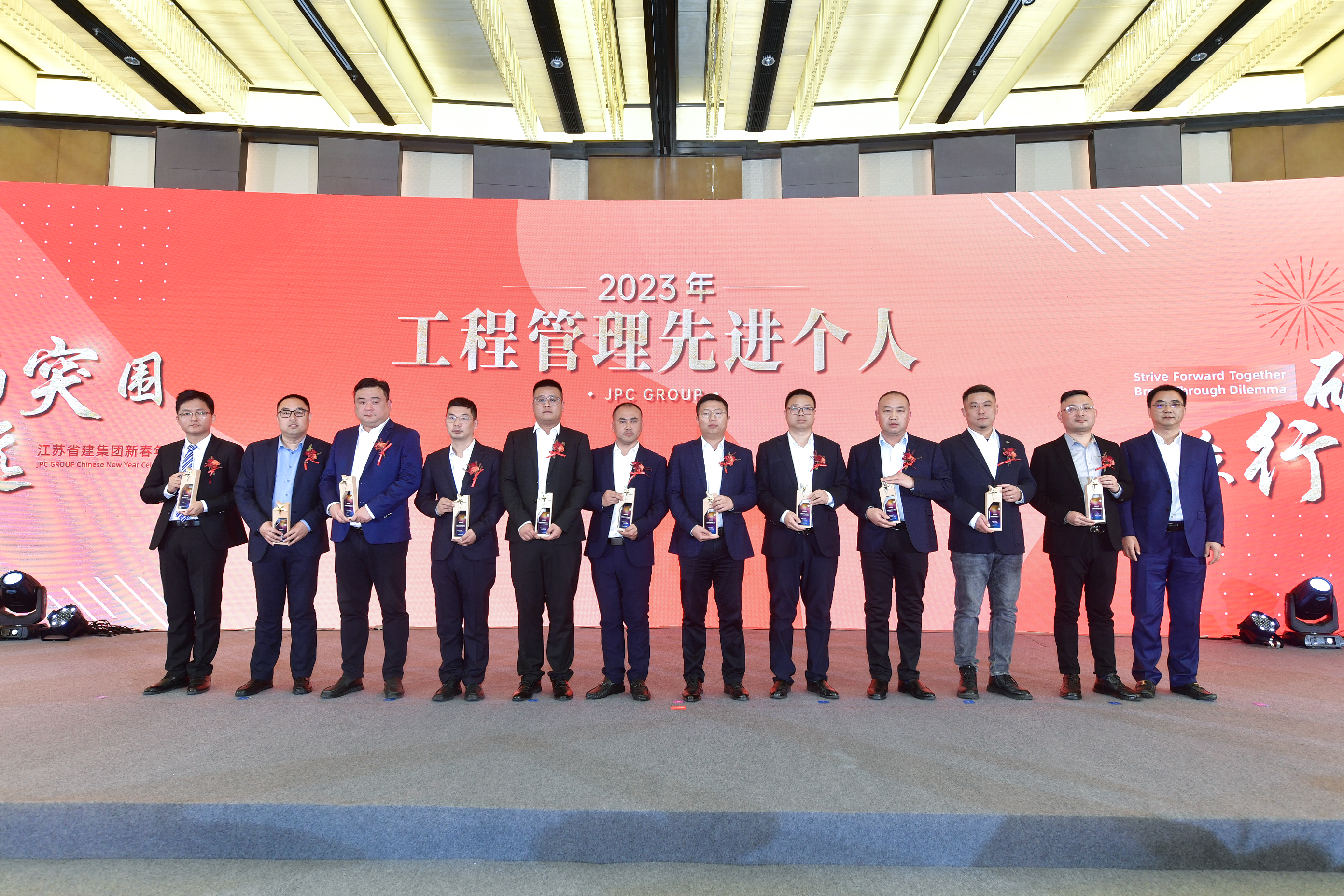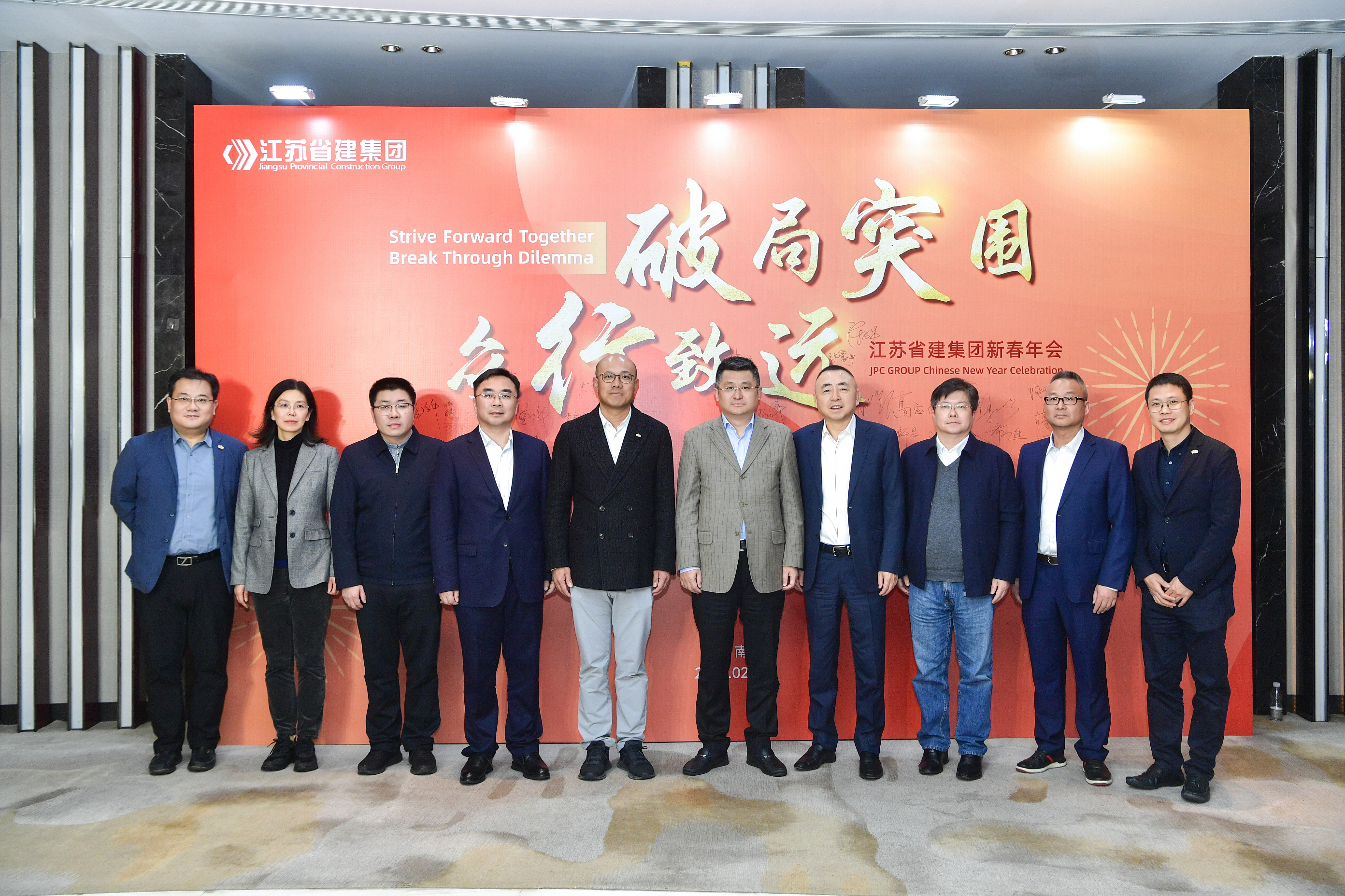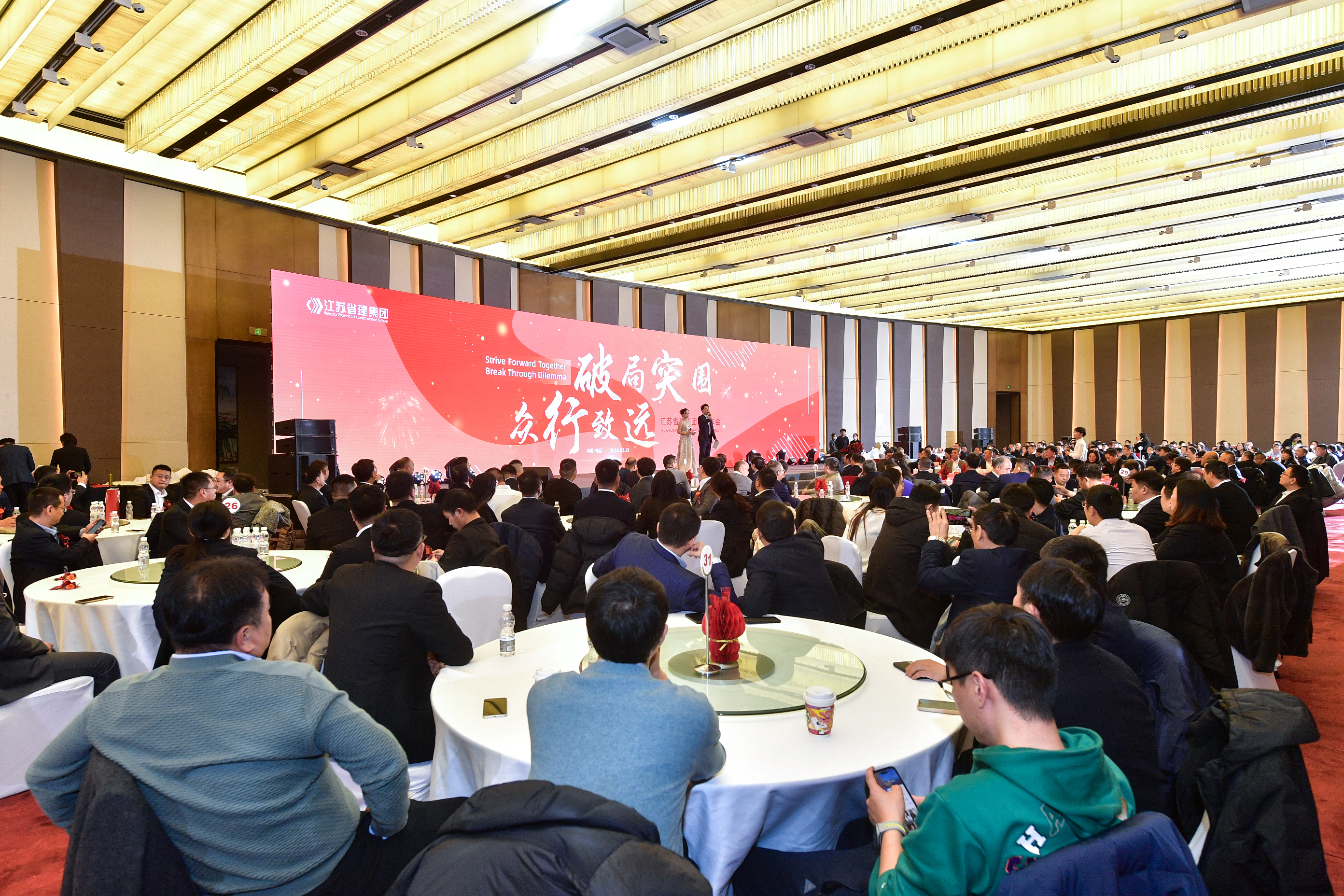2月21日下午,“破局突围 众行致远”米乐官方网页版新春年会在南京华泰万丽酒店举行。江苏省住房和城乡建设厅党组成员、副厅长李震,绿地集团执行总裁、绿地大基建集团总裁陈军,省住房和城乡建设厅建筑市场监管处处长汪志强、工程质量安全监管处处长蒋惠明、行政审批处处长肖屹、省建设工程招标投标办公室主任顾颖,绿地大基建集团运营管理中心总经理刘青、总经理助理郑景申,集团公司董事长陈正华、总裁蒋宁、党委书记仇天青,与300余名省建人齐聚一堂,分享喜悦,见证荣耀,共启新年奋进之路。